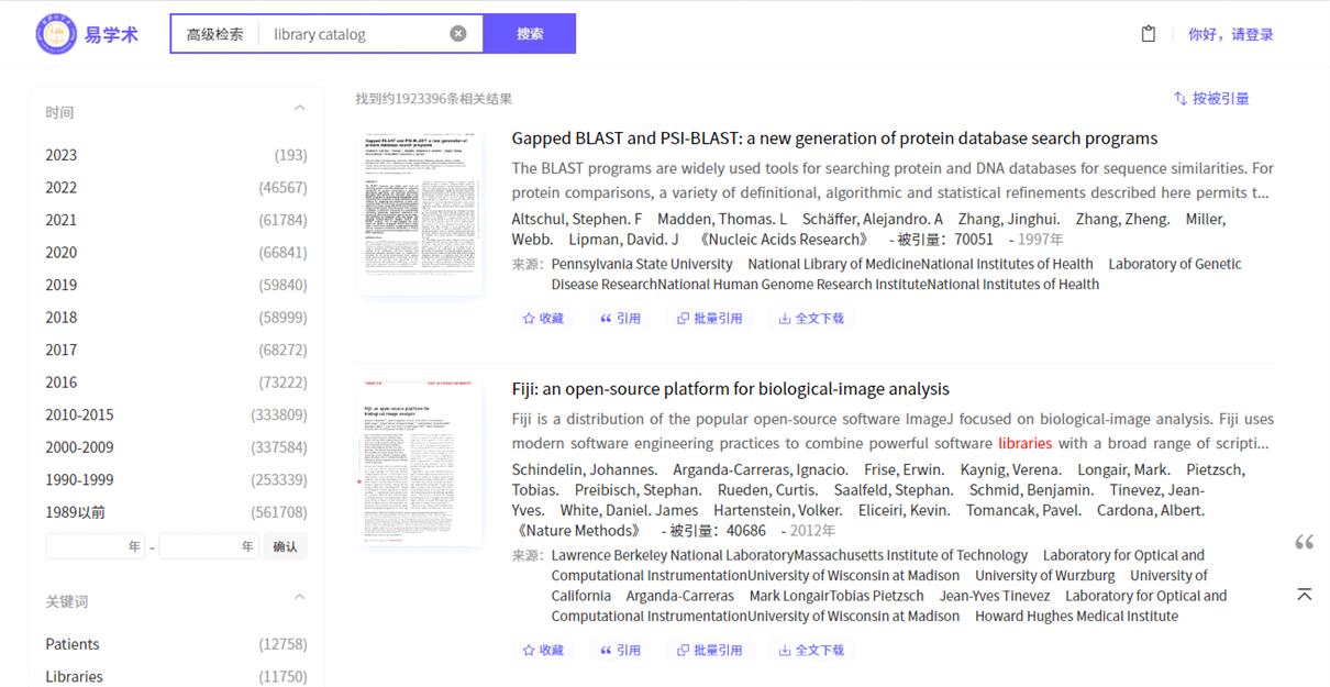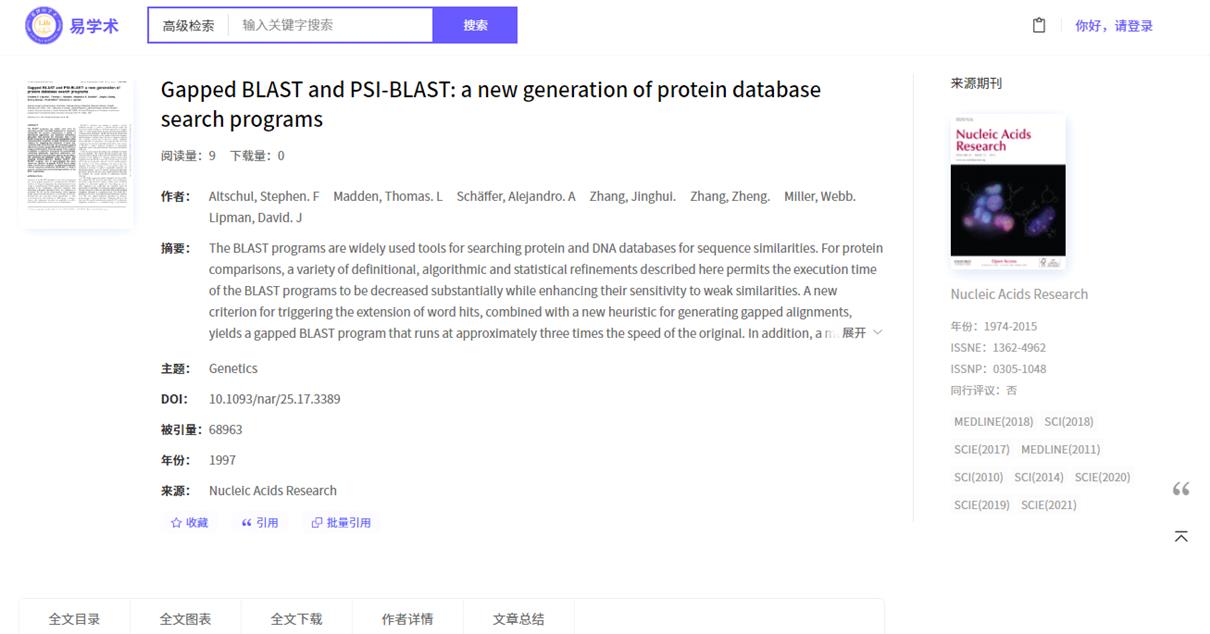 EA学术资源库涵盖了13万种外文期刊、1.6亿条外文文献数据、26亿条引文数据,提供6300万篇全文下载。全面覆盖科技、医学、农业、交通、航空航天、社会科学、艺术与人文科学等全球研究成果。资源库使用大数据分析和人工智能(AI)技术,将散落于互联网中的外文文献信息进行汇聚整合,并对海量文献数据进行深度挖掘、精准提炼、关联分析和精细加工后形成了高质量外文文献数据库和自有引文网络数据库。该数据库利用人工智能分析引擎对高引用文章和经典文献进行文献总结,从而更好地辅助读者对学术文献的理解和利用,极大提升科研效率。