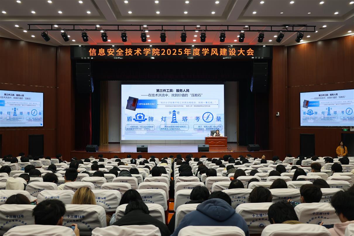 为持续强化学风建设,营造积极向上的育人氛围,信息安全技术学院于1月14日晚在礼堂召开2025年度学风建设大会。学院主要负责人、全体教师、辅导员及学生代表齐聚一堂,共同回顾过去一年的学风建设成果,展望未来发展蓝图。