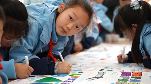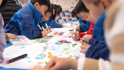 随后的共绘“护水画卷”环节,我校“菁彩青年链未来”志愿服务队及“玩”美生活美育工作室师生带领孩子们,以“守护好一江碧水”为主题挥毫创作。孩子们用五彩画笔勾勒生态美景,将节水愿景融入笔墨,在审美与实践中感受水之美、筑牢护水意识。