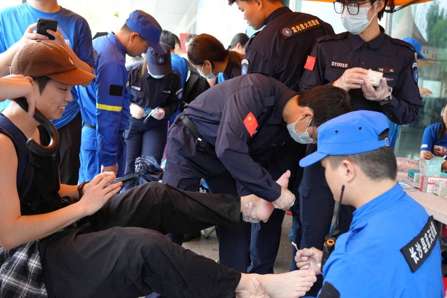 4 20 2025 长沙半程马拉松盛大开启。来自全国各地的 15000 名跑者齐聚一堂,共同参与这一盛事。蓝光星火志愿者服务团负责医疗资源的保障药品补充,保证每位运动员的身体健康,是春风里的守护者,是流动的生命勋章,更是当代青年用行动写下的青春注脚。“蓝”是湘江的底色,“星火”是每一份微小却炽热的力量。在晨雾未散时,湘江在低语;当第一缕光漫过岳麓山的轮廓,江水正将星子揉碎成粼粼波光,岸边的风拾起零落的足音。这座城市,等待一场与奔跑的盛大重逢。蓝光星火志愿队用专业与温情守护每一位跑者的 21 公里征程。